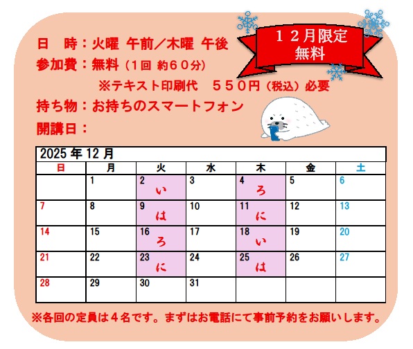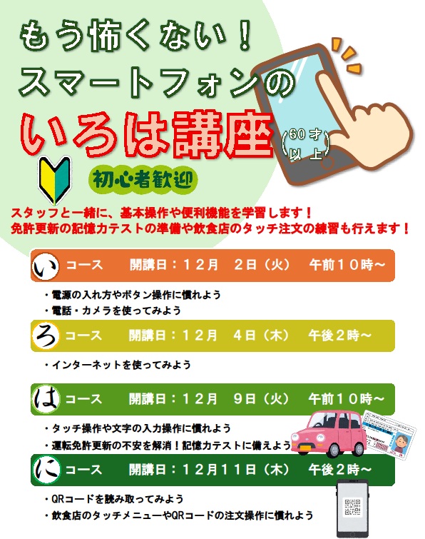 2025年12月3日 2025年12月3日 まるちねっと高岡 お知らせ もう怖くない!スマホ「いろは講座」 初心者歓迎・60才以上対象スタッフと一緒に、スマートフォンの基本操作や便利機能を学びましょう。免許更新の記憶力テスト対策や、飲食店でのタッチ注文の練習もできます。